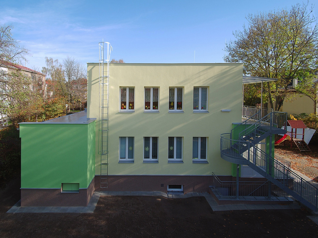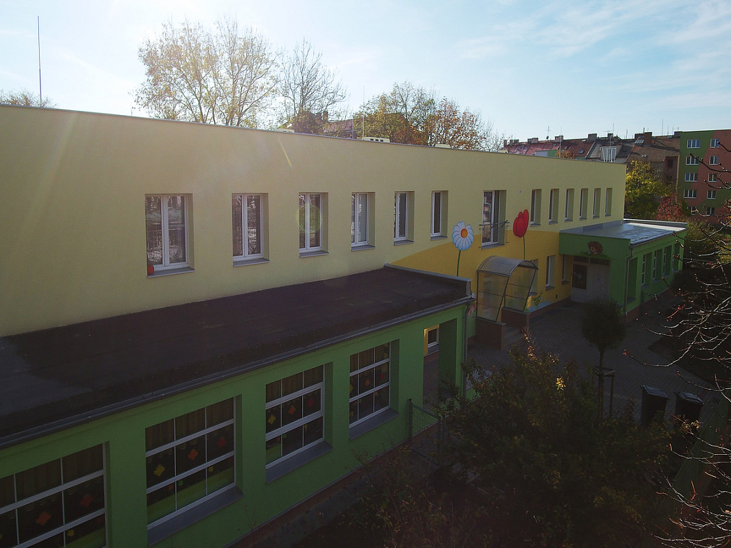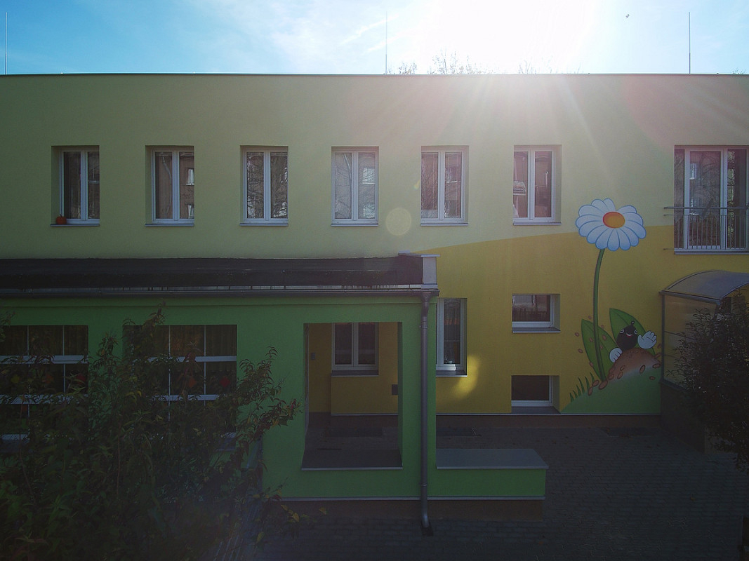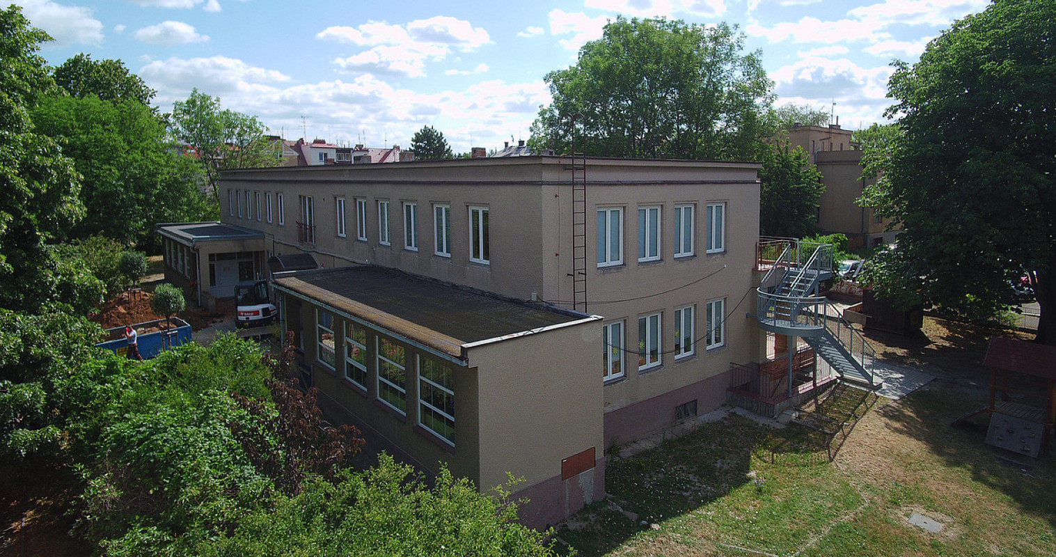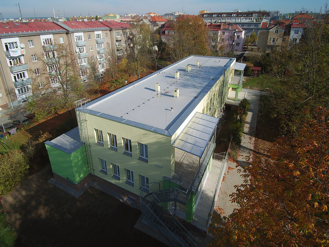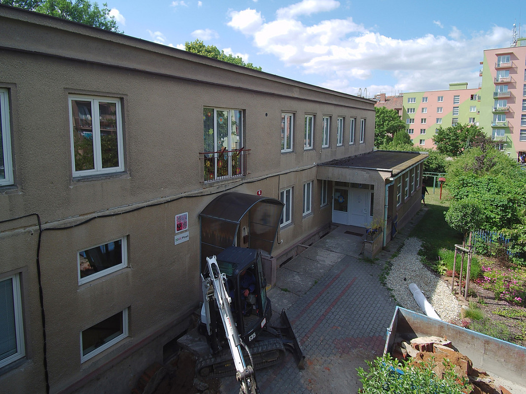 Zateplení fasády a střešního pláště budovy 51. mateřské školy v Plzni, ulice Částkova. Sanace suterénu. Realizace 2019.