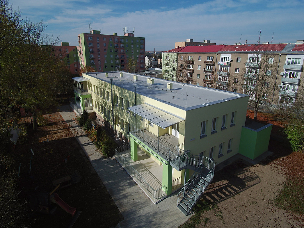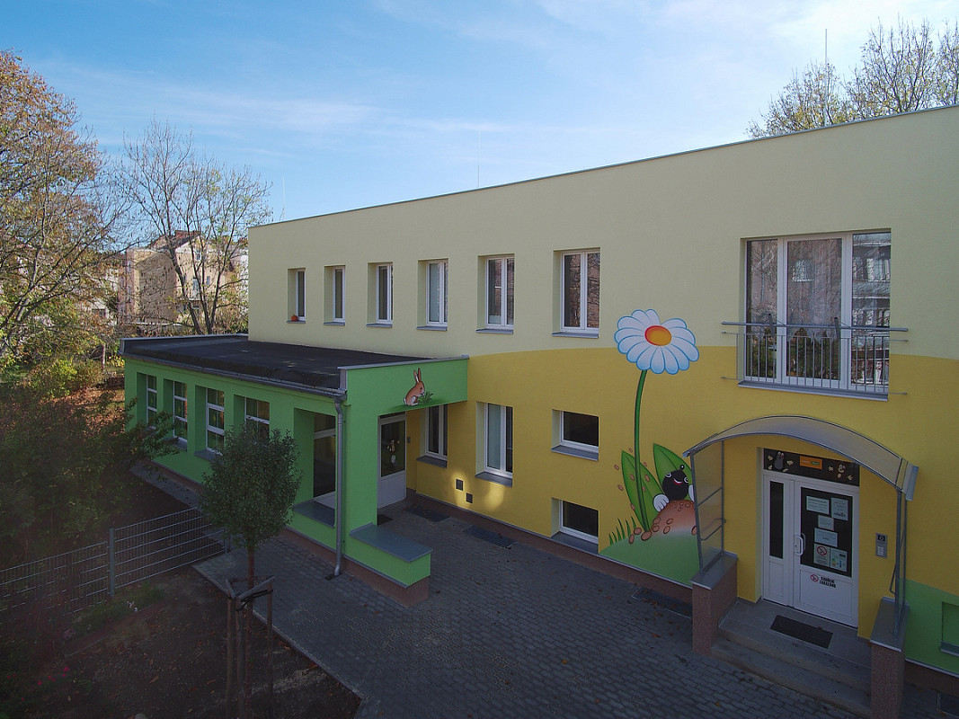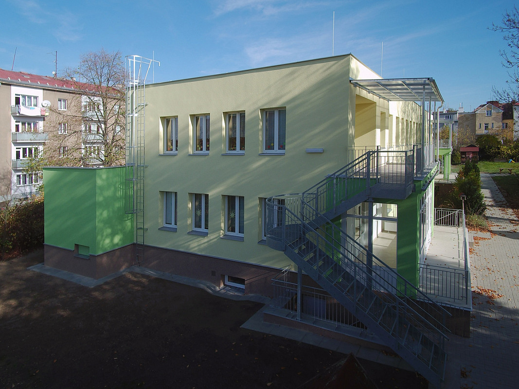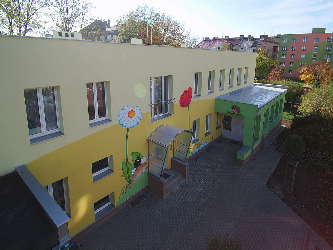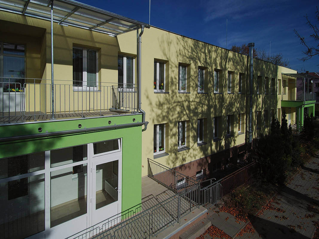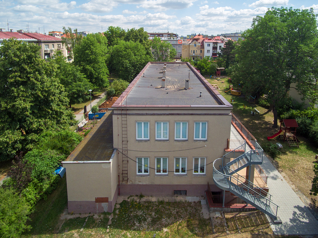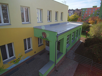 Zateplení fasády a střešního pláště budovy 51. mateřské školy v Plzni, ulice Částkova. Sanace suterénu. Realizace 2019.