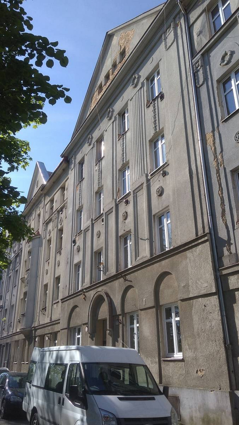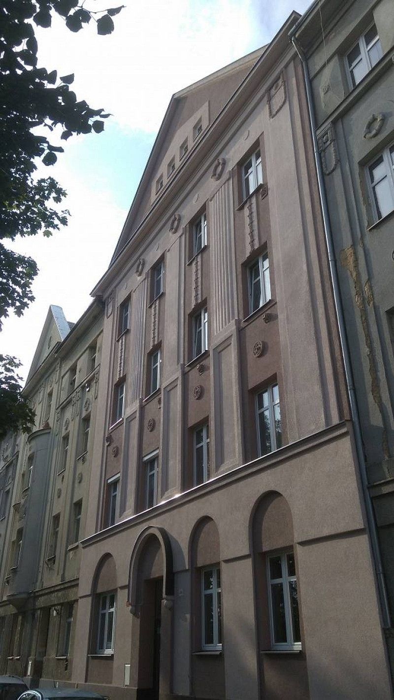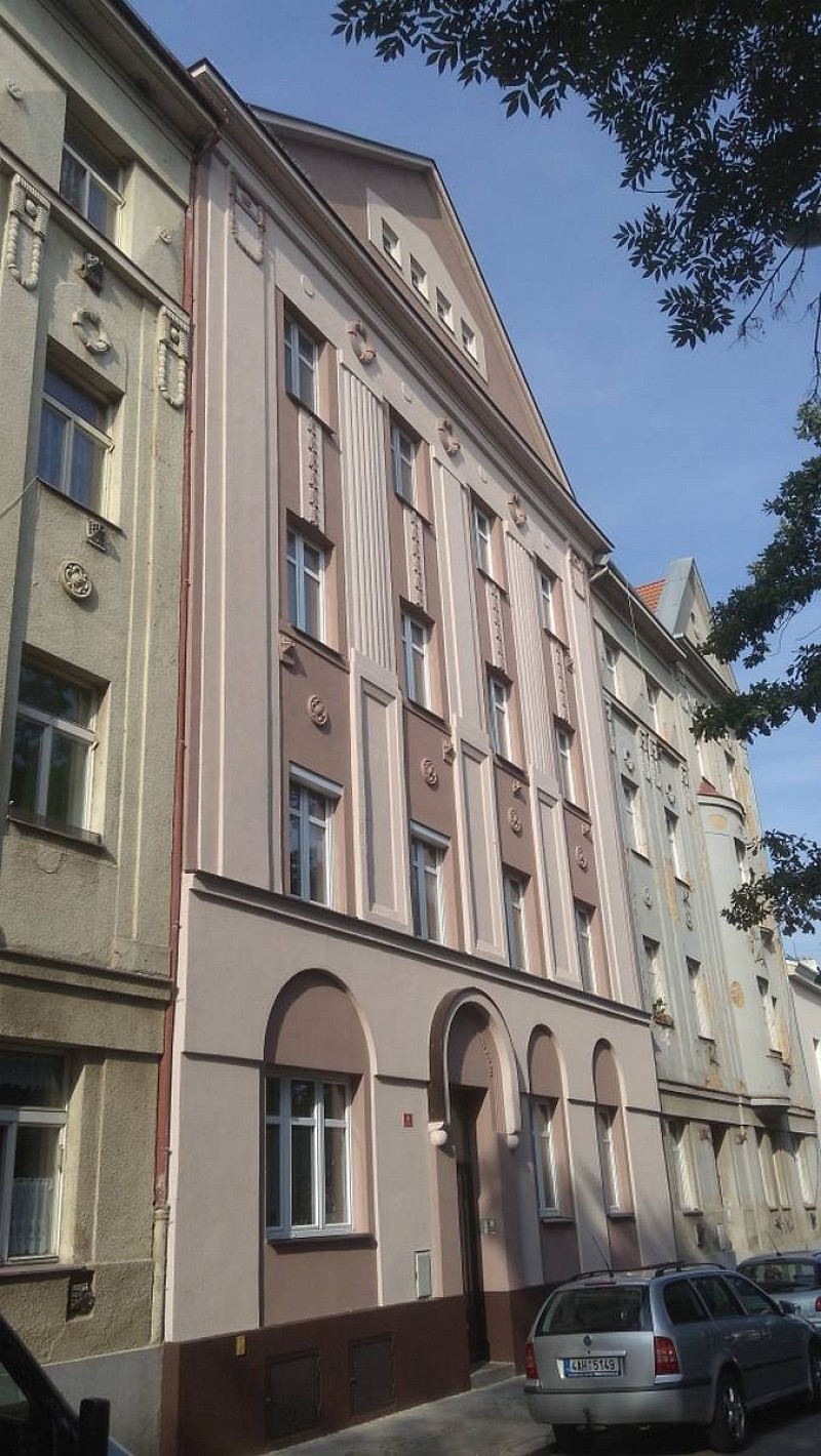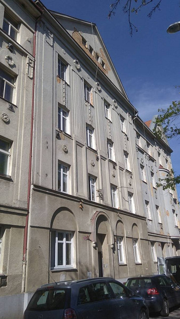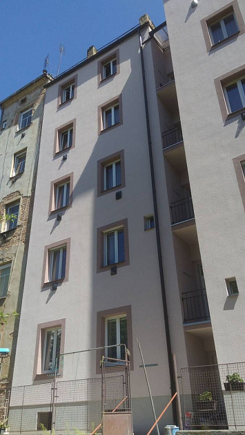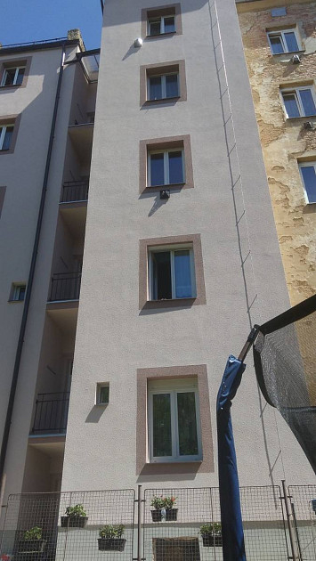 Zateplení zadní části a rekonstrukce přední části fasády bytového domu Lipová 38, Plzeň. Kombinace zateplení a opravy historické fasády, 2017.