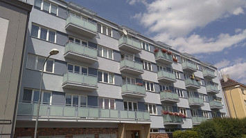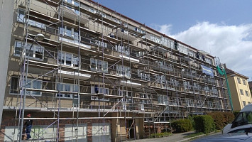 Hydroizolace, nová dlažba a zábradlí balkonů bytového domu Republikánská 5, Plzeň. Nátěr fasády, 2017.