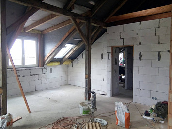 Půdní vestavba čtyř bytových jednotek na klíč v objektu Živnostenská 21, Plzeň. Kompletní realizace bytů včetně rozvodů a vybavení, 2015.